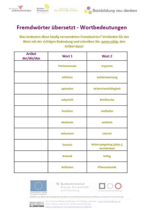 Zuordnung häufig benutzter Fremdwörter und deren Übersetzung