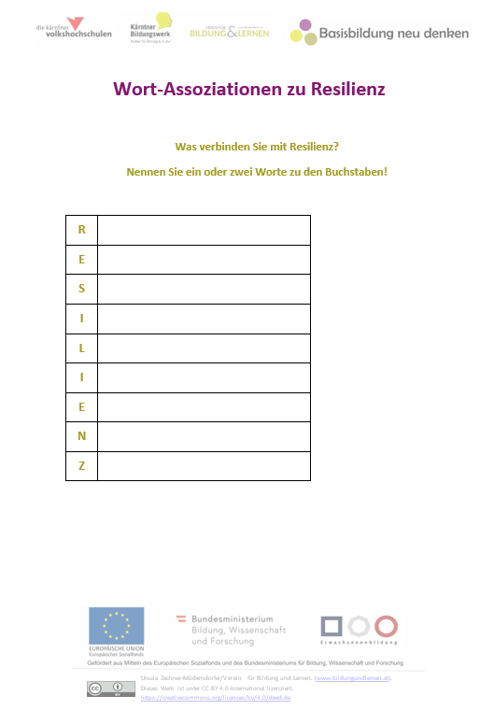 Wort-Assoziationen zum Begriff Resilienz herstellen und Sichtbar-Machen der bereits vorhandenen Erfahrungen zu diesem Thema. Was verbinden die TeilnehmerInnen mit Resilienz?